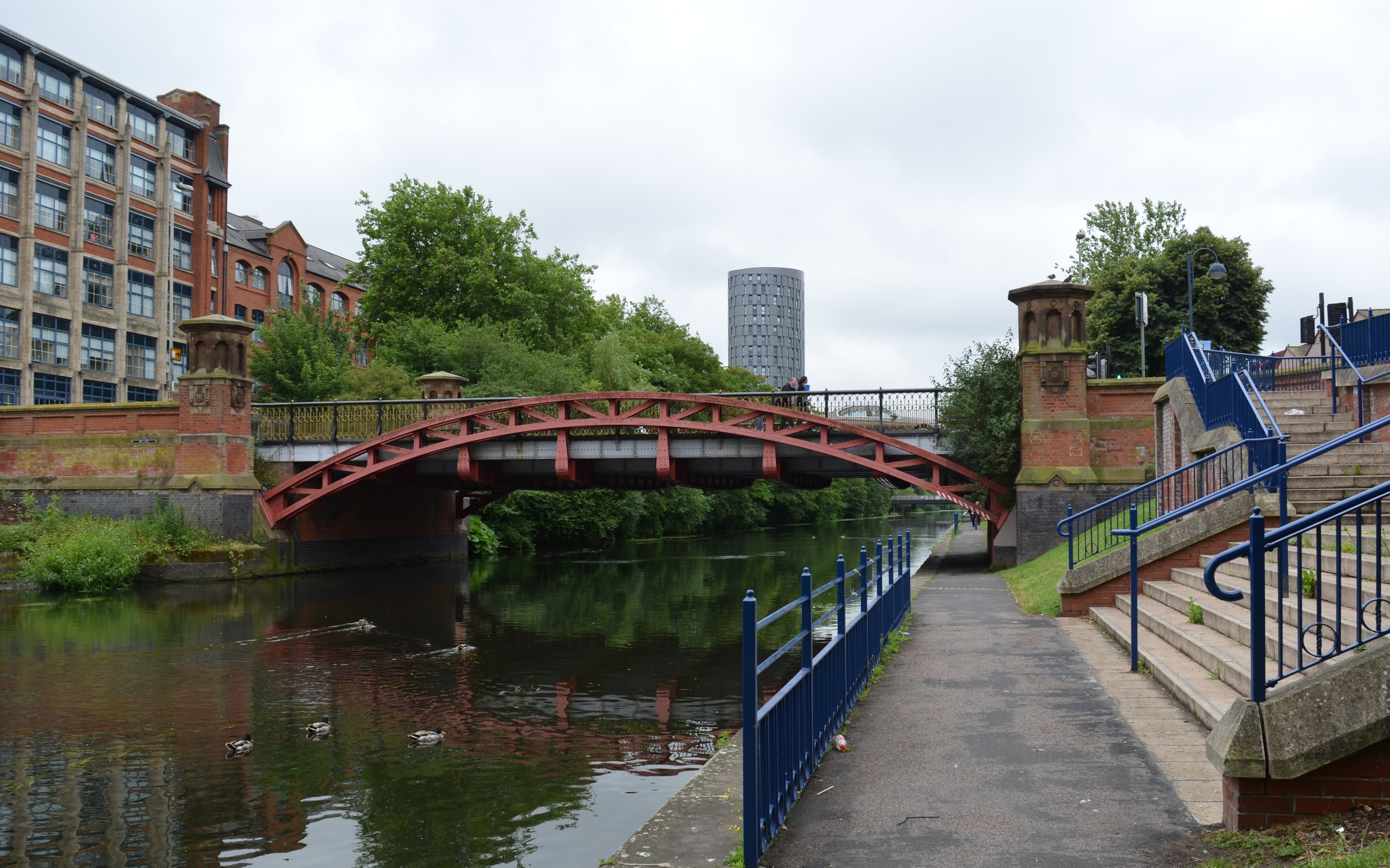 This 1.5 mile stretch of the Soar-Grand Union Canal runs northwards from the Aylestone Meadows NR to Castle Gardens. and includes much of the canalised 'Mile Straight'. The modern Leicester City football ground (currently the King Power Stadium) lies on the eastern bank opposite the weir and lock at Freemens Meadow. Just to the north opposite Filbert Street (site of the former football stadium) the River Soar splits off to the west whilst the Canal continues northwards flanked by the buildings of Leicester's De Montfort University. There is a continuous footpath along the western bank of the waterway and access to the eastern bank at many points.