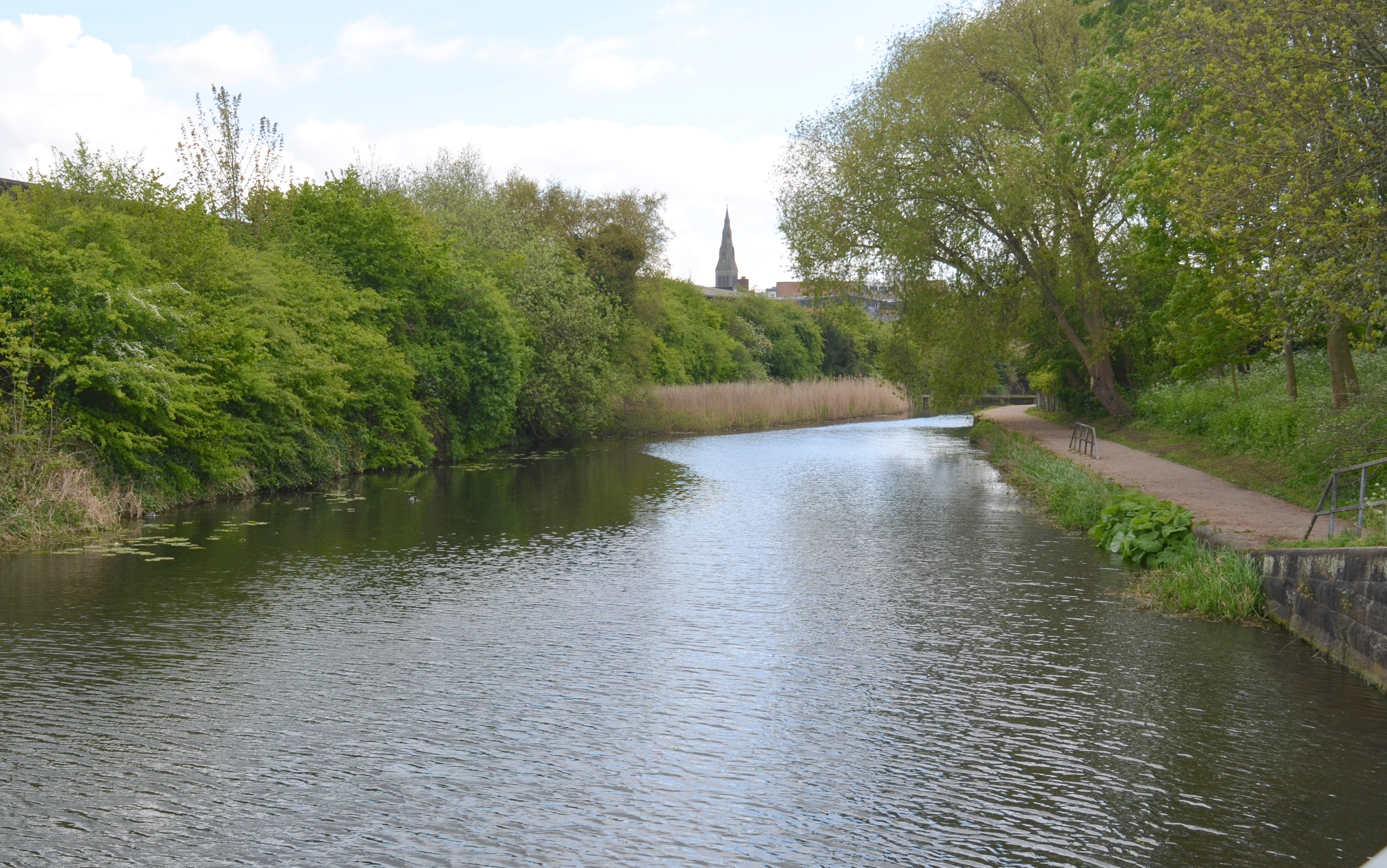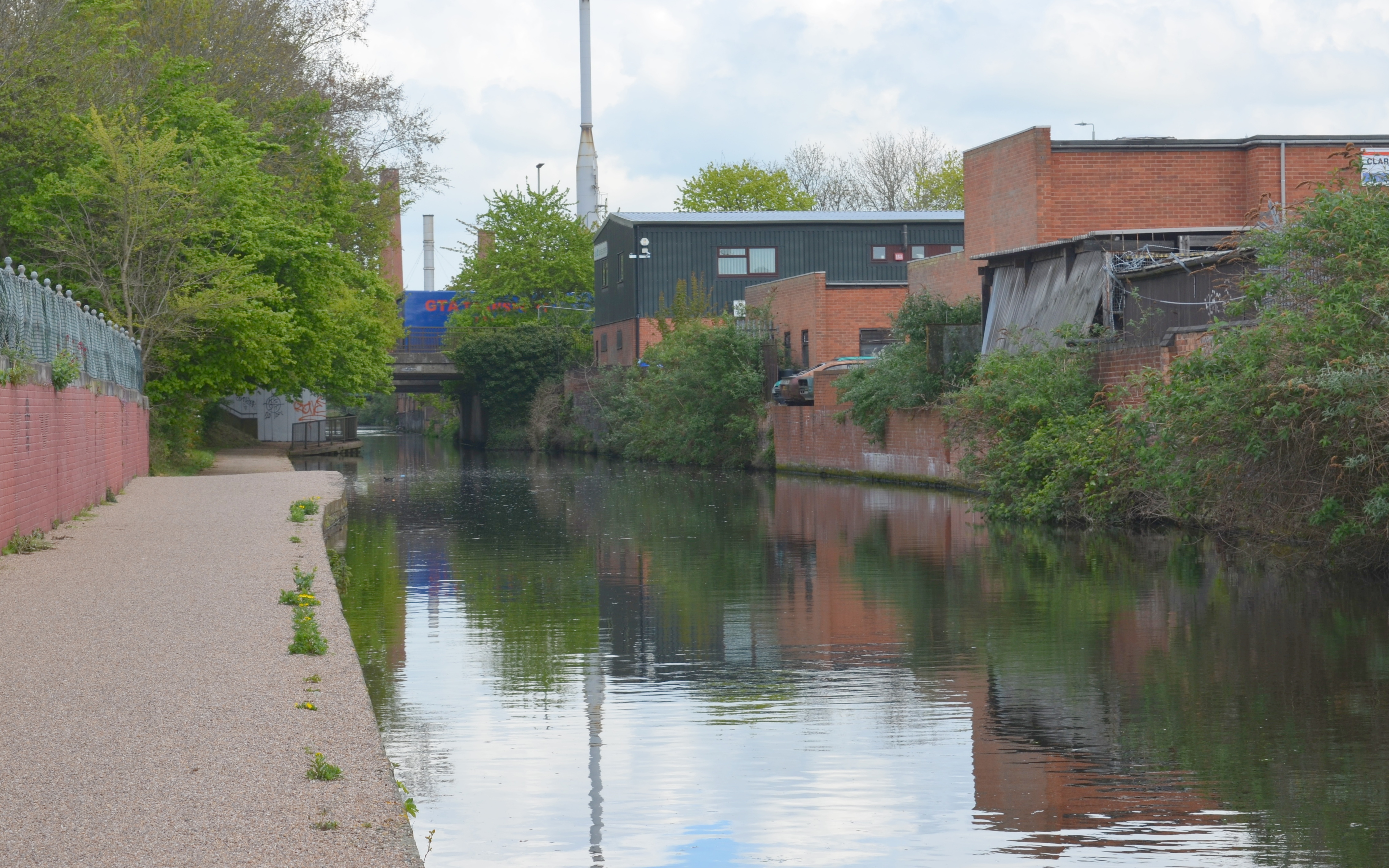 This stretch of the River Soar-Grand Union Canal extends for about a mile north from the double road bridges of the A47 (St Augustine Road) to the A6 that runs along the southwestern side of Abbey Park. Just north of the A47 the iconic Friars Mill building lies on the eastern bank before the canal and river are split with two weirs separating the unnavigable river running immediately west of the Canal. These two components then diverge and continue north east to the A6. There is a continuous towpath-footpath along the western bank of the canalised waterway throughout, but the short separate stretch of the River Soar is flanked by commercial properties and can only be viewed from the A50 road bridge at Frog Island.