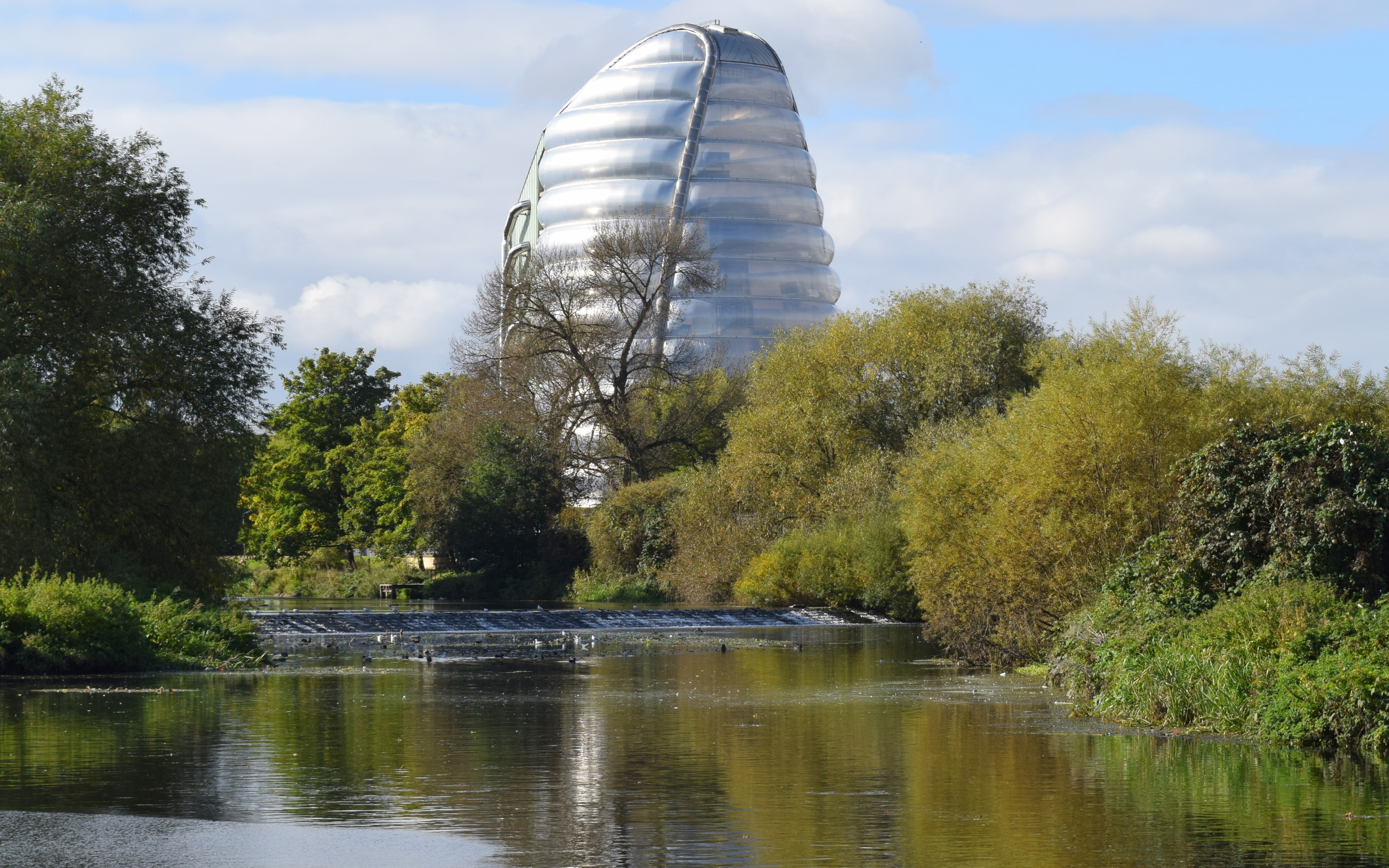 This mile long section covers the independent routes of the River Soar and to the east the Grand Union Canal north from Abbey Park Road (B5327) to their confluence at Belgrave Lock (left-hand image above) just south of the recently created Ellis Meadows wild place. Tow-footpaths run along the western side of both the the river and canal segments. The area between the two watercourses is known as Wolsey Island after the former hosiery factory and the skyline is dominated by the preserved Wolsey Chimney monument. Much of this area has been undergoing redevelopment for housing in recent years. The futuristic shape of the National Space Centre on the west bank of the River Soar is also prominent landmark (see centre image above).