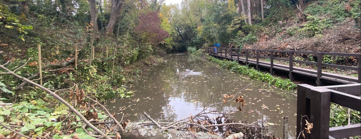 Nestled between Montrose School and the playing fields is a rather unique feature: a ravine. This pit was, in all likelihood, used as a grab pit during the construction of the Great Central Way. Over time, it has been colonised by nature: Leicester’s clay soils have supported the creation of a lake at the bottom of the ravine, and its banks have become home to an array of flora. Over time, the lake became completely shaded and so work was carried out to allow more light to enter the ravine. Additional interventions to enhance the biodiversity of the site have included cleaning duckweed, installing erosion barriers (via the creation of dead hedges), tree planting, building a hibernaculum for amphibians and installing bird and bat boxes.