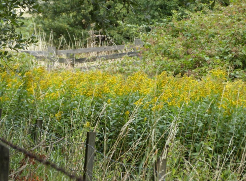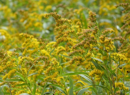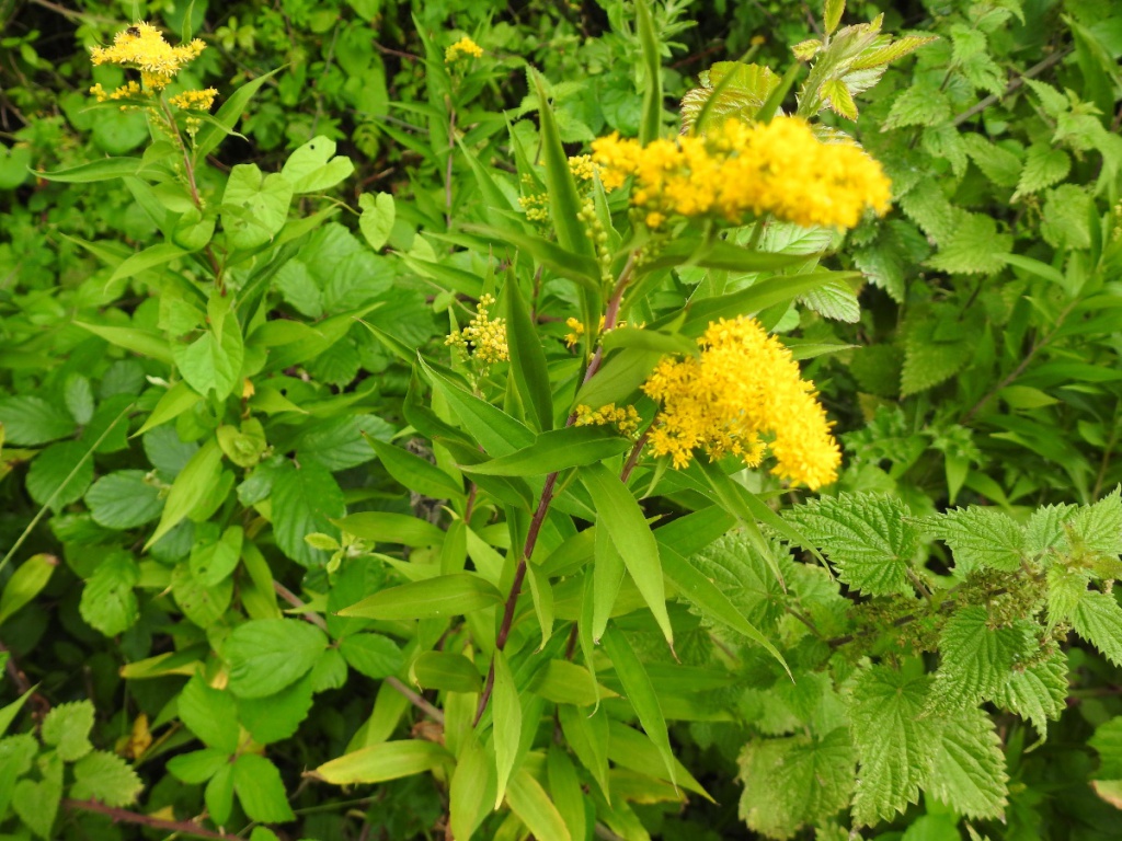 The golden flower spikes are similar to Canadian Goldenrod (Solidago canadensis). In Early Goldenrod the upper surface of the leaves and the stem are practically hairless. A tall rhizomatous plant growing to 2.5 metres.