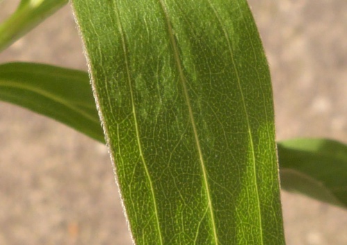 Leaves serrate, at least near apex; leaves glabrous or hairy only on lower veins; stems more or less glabrous below flower head