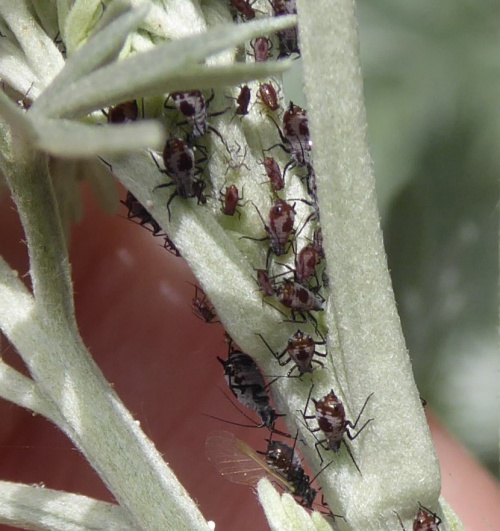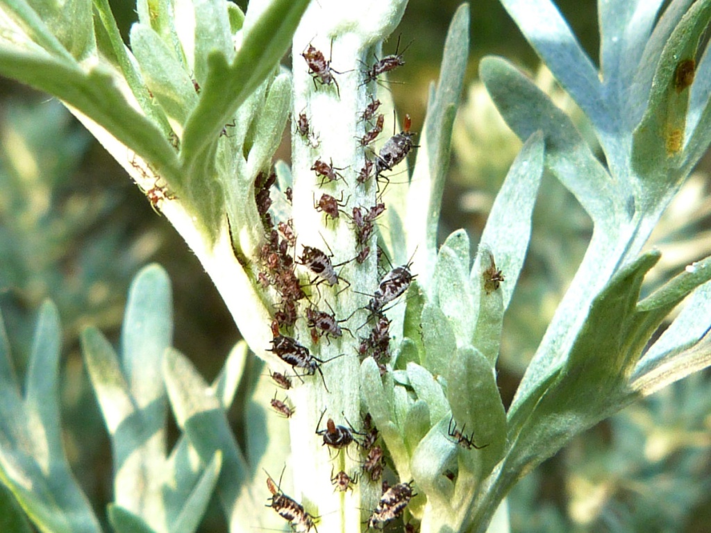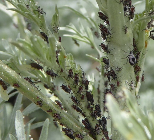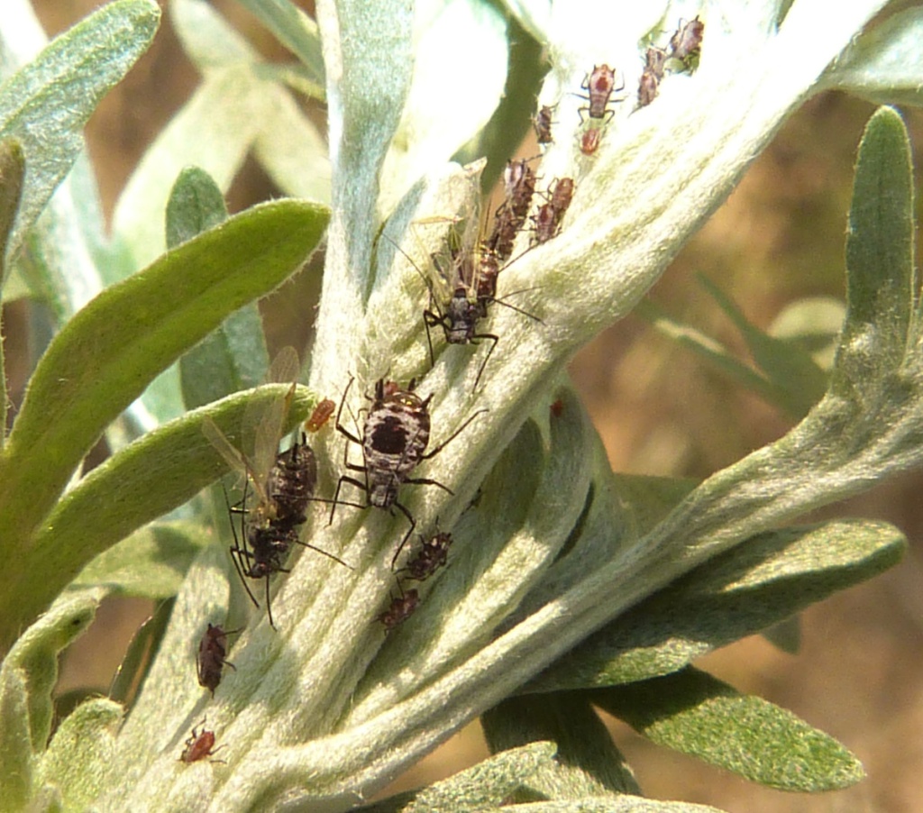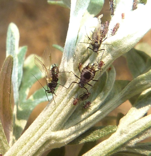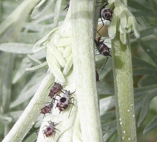 The aphid Macrosiphoniella absinthii is associated with Wormwood and other Artemisia species. The apterae have a body length of 1.7 to 2.5 mm. It is reddish-brown and wax-powdered. It has a black head, antennae, legs, siphunculi and cauda, and a black spot in the centre of the abdomen which is highlighted by a white surround of powdered wax. The siphunculi are very thick and short.