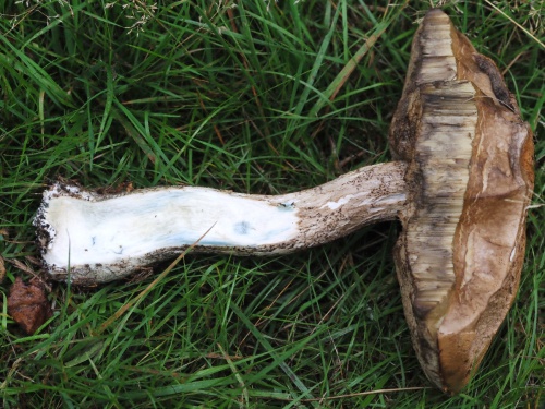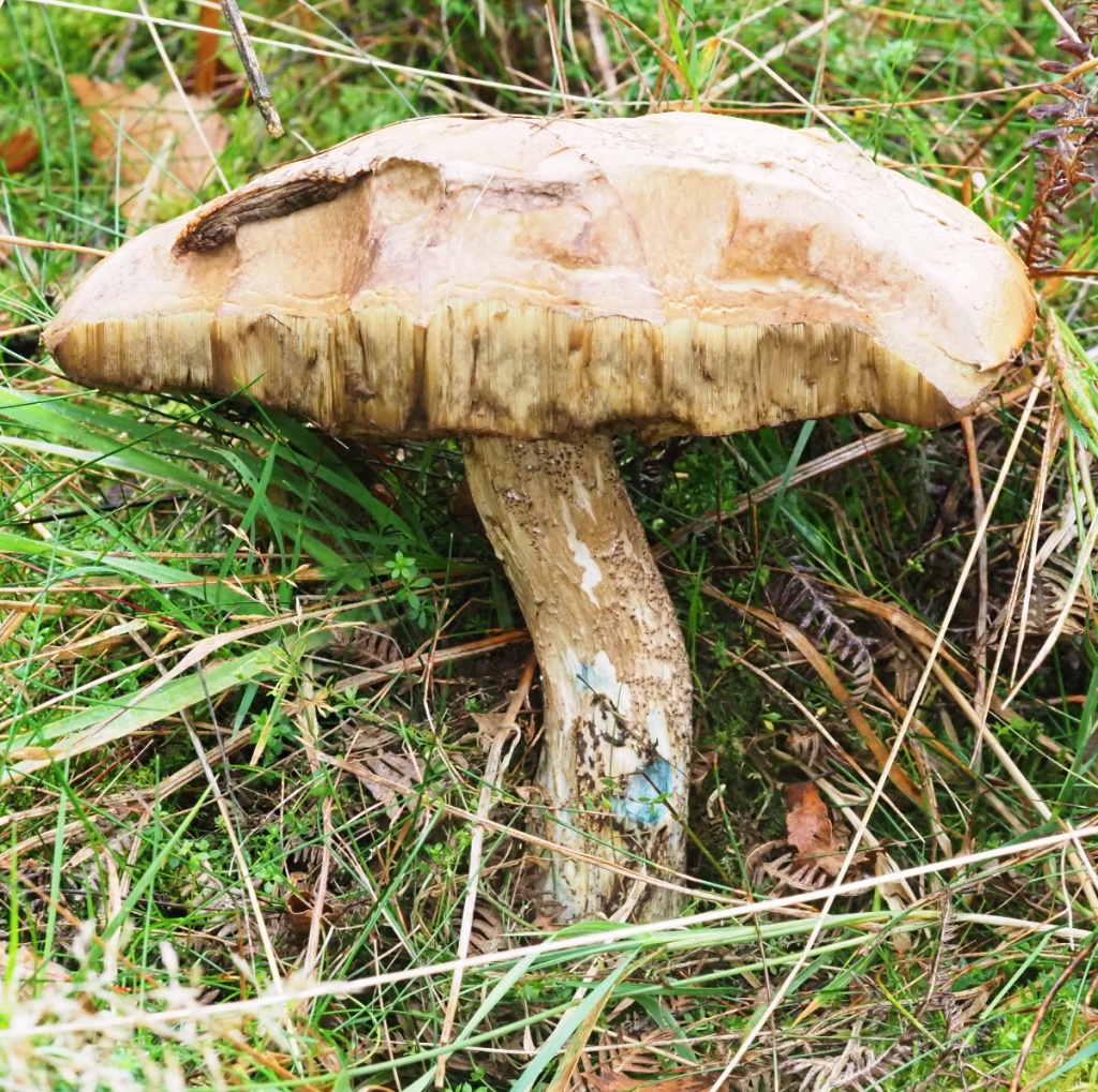 Very similar to the Brown Birch Bolete but with white or pale brown woolly scales on the stipe, which stains blue when cut and then bruised.