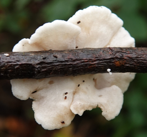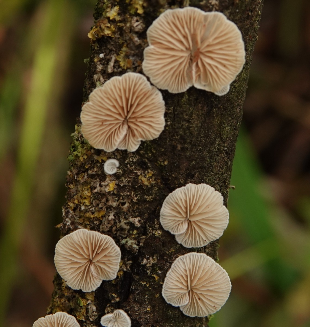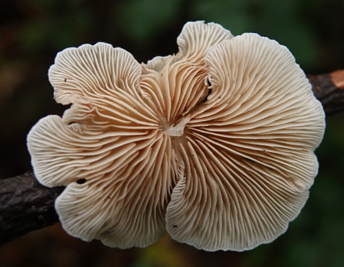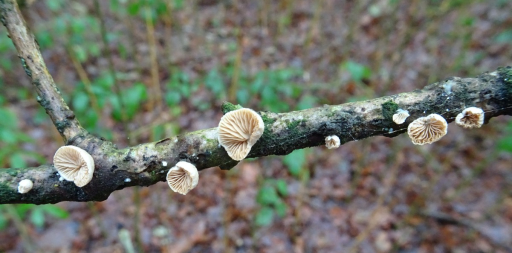 Oysterlings are small whitish or brownish fungi found on twigs and branches, often darkening with age. They are stemless or with rudimentary stipes and are attached to the substrate laterally (via one side of the cap, forming brackets) or centrally (via the cap, forming circular, shell-shaped or kidney shaped fans). The gills fan out from the point of attachment. Spores are brownish, ochre or buff. There are several species that are difficult to identify.