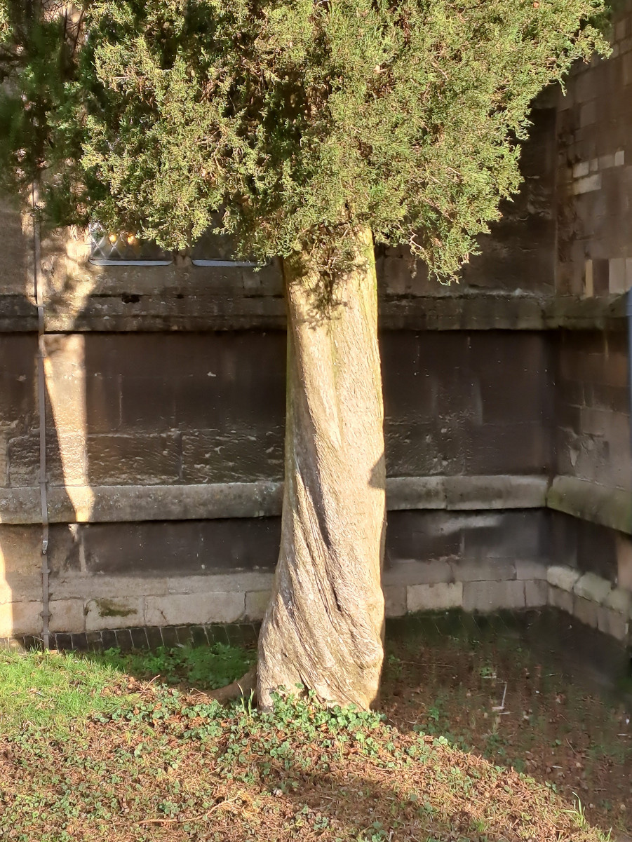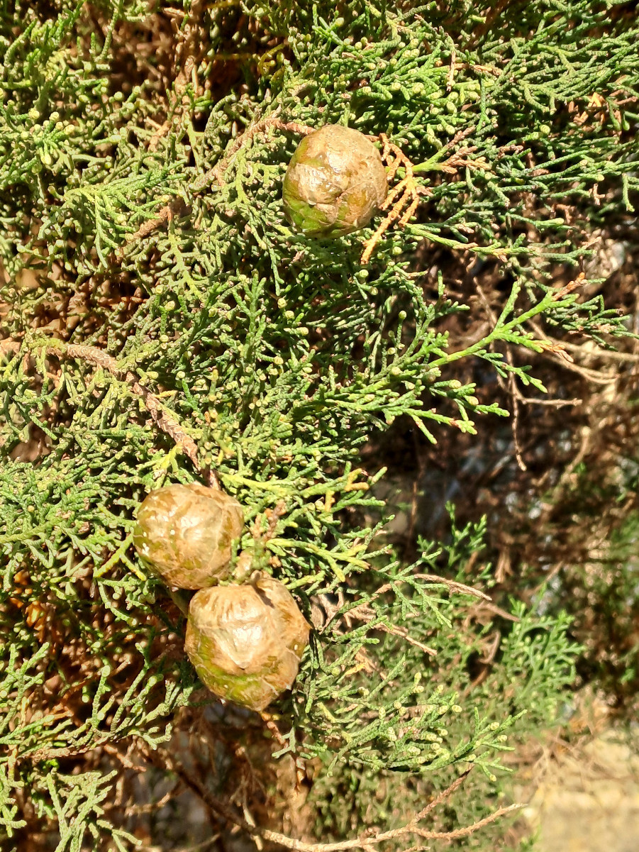 This is a true Cypress, with branchlets at the end of shoots spreading in 3 dimensions, unlike the flattened branchlets of species like Lawson's Cypress. The narrowly fastigiate form (familiar from Mediterranean landscapes) is usually planted. The branchlets are smoothly cylindrical, not roughened with obtuse leaf tips (ref. Stace, 4th edition). The new cones are large and either lumpy or rounded, made of scales that each have a spine in the middle.