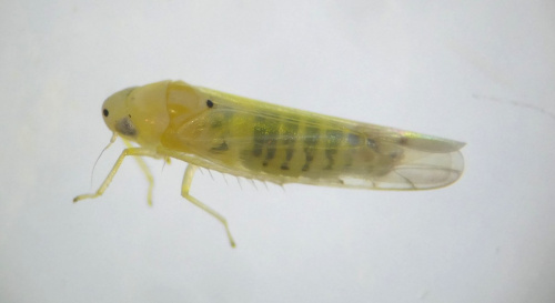 A small leafhopper associated with various deciduous trees and shrubs. Pale yellowish foreparts with greyish marks at forewing apex; these marks may be indistinct.  Soem specimens have spots at the tip of the vertex and a small black spot at the apex of the pronotum, but these marks are variable and males/females differ.  Disssection of males to examine internal genitalia is needed to confirm identification.
