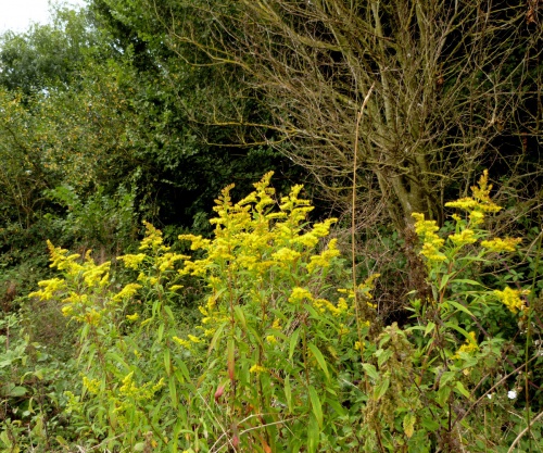 Vigorous medium to tall plant with erect stems to 1.5 metres. Densely leafy, leaves pointed and toothed. Flowerheads golden yellow 5 to 6mm each with 10 to 17 short rays in broad pyramidal panicles.