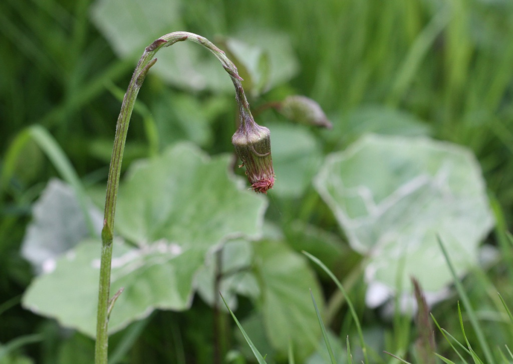 Low to short, downy, creeping plant stems erect, purplish-scaly, unbranched. Leaves all basal, rounded-heart-shaped, shallowly lobed or toothed, mealy white above when young, white felted beneath. Flowers yellow 13 to 15 mm with narrow rays, solitary. Erect in bud, nodding as the flowers fade. Fruit a white 'clock'.