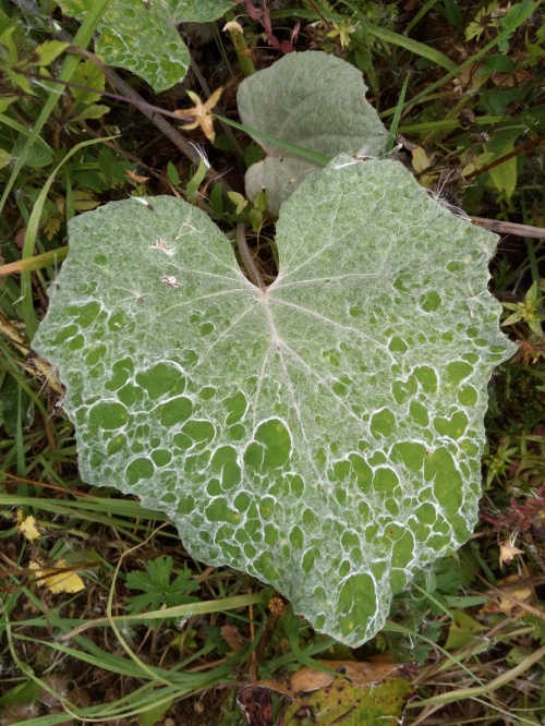 The larva of the Agromyzid fly Phytomyza tussilaginis mines the leaves of Butterbur, Colt’s-foot and Winter Heliotrope, producing a long narrow mine, widening at the end and often forming a secondary blotch.