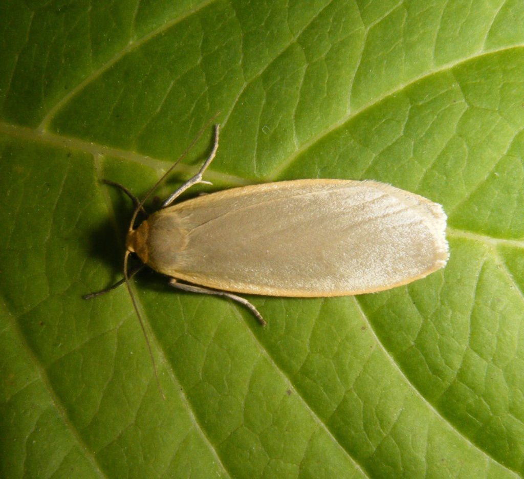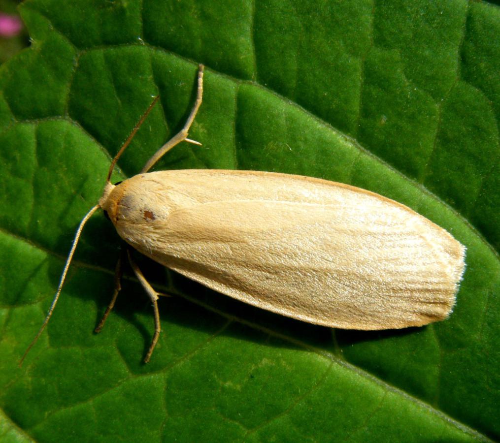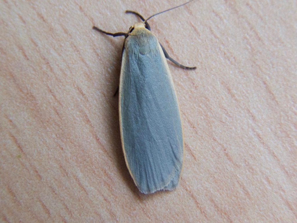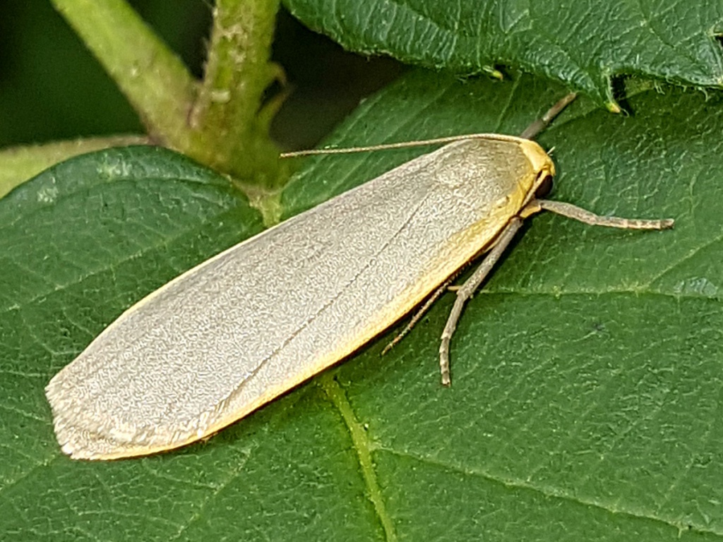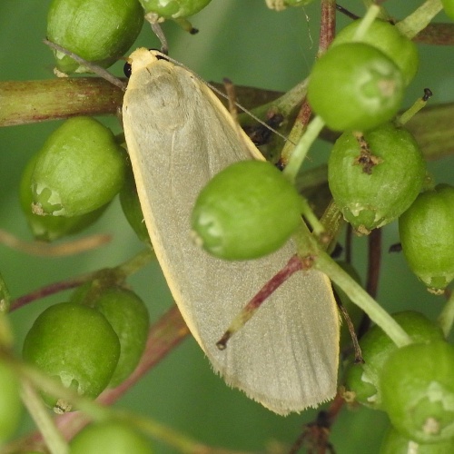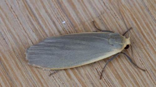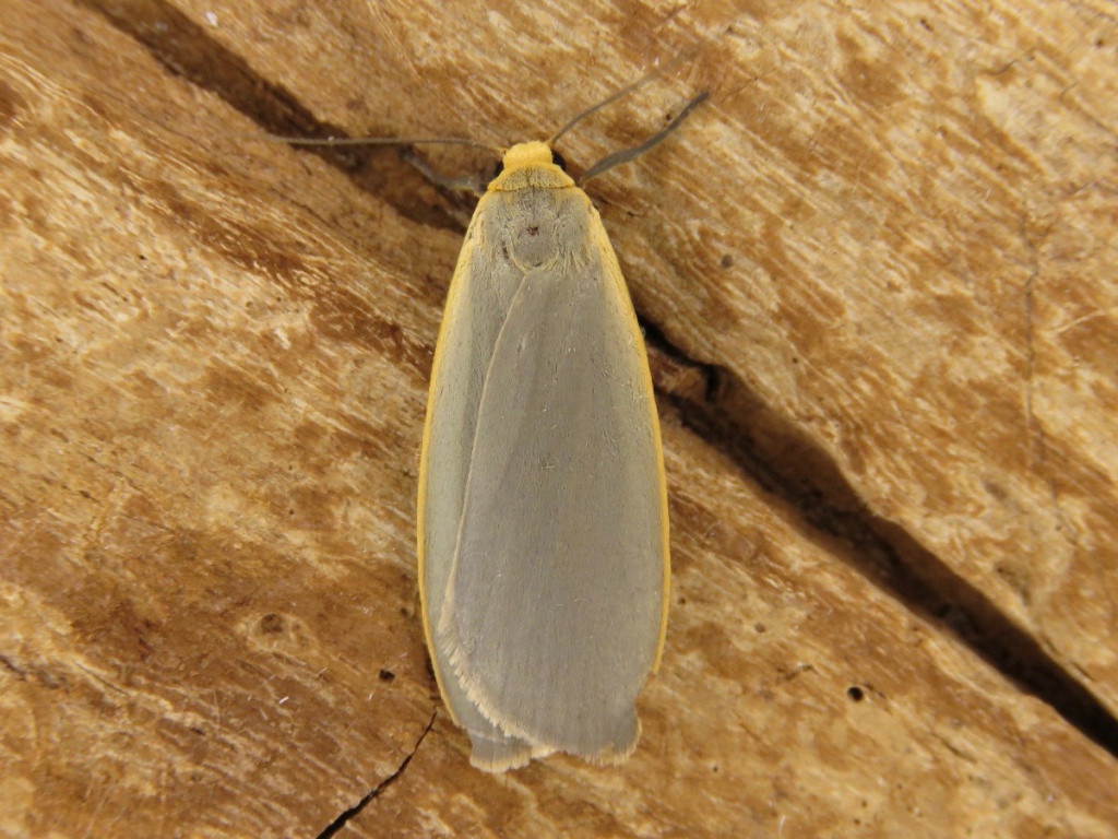 Of these Common Footman is by far the commonest, and the Buff Footman probably the most scarce. The Dingy Footman shows a wide 'melonseed' shape, so stands out versus Common Footman. Even for a Dingy Footman in the yellower colour form, the shape should help separate from Buff Footman. On the Buff Footman, there is a distinct 'crease' coming from the thorax down the center of the basal part of the forewing, and in the resting posture the back end always looks 'squarer' than on the Common Footman. The Scarce Footman pretty much speaks for itself with its tightly wrapped resting posture.