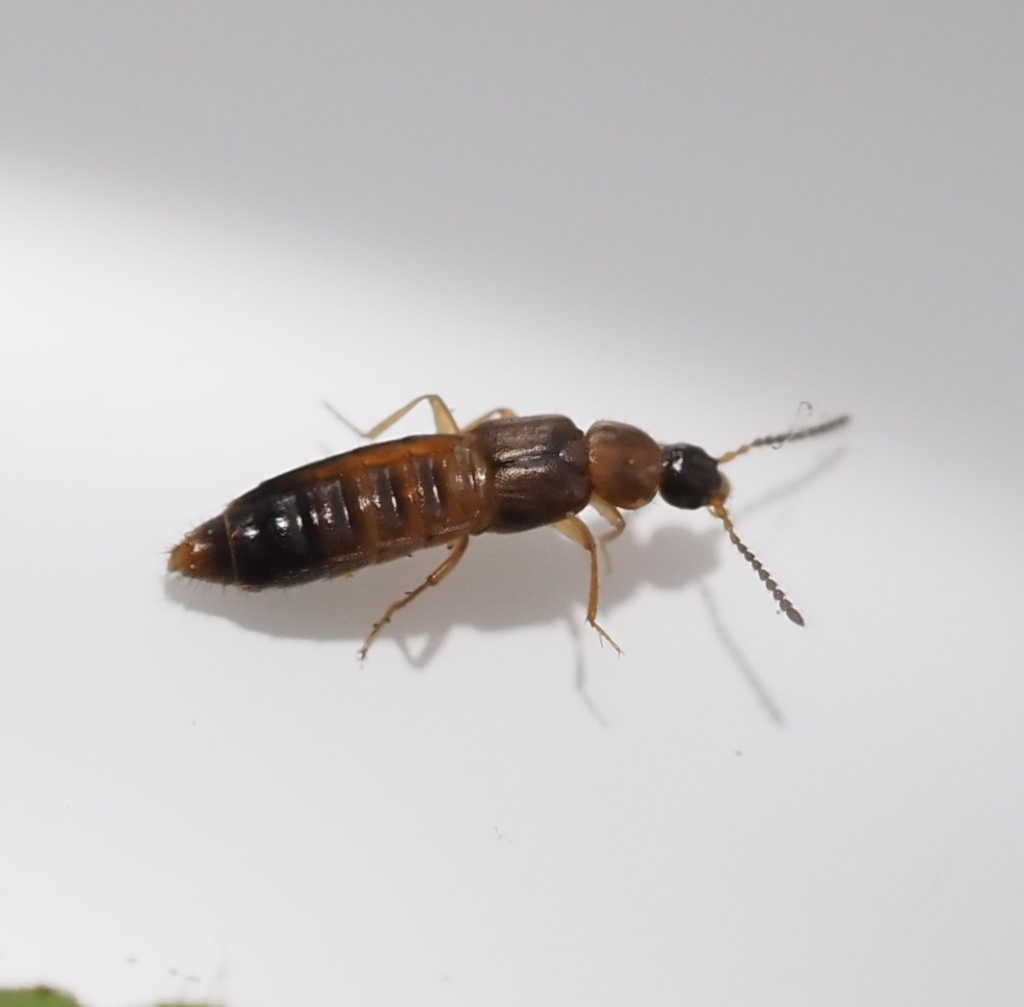 A small (about 5 mm), slender rove beetle. It is predominantly reddish brown but the rear of the abdomen is darker than the rest of the body. The legs are reddish-yellow and rather long. Abdomen is broadest in the middle.