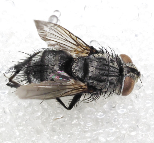 Length about 8 mm. This is a fly with a well marked black and buff/grey abdomen. It also has the usual hairy body of the Tachinidae family.