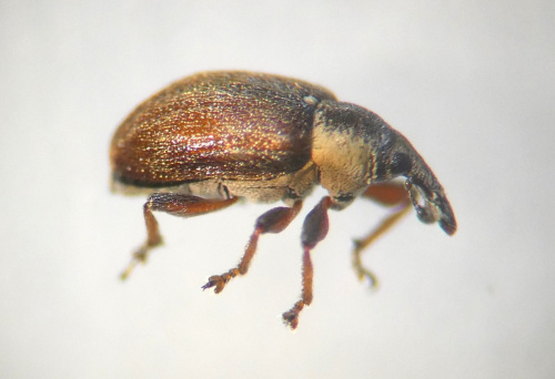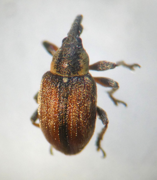 A small brown weevil 2-3mm, with long hairs on the pronotum and elytra.