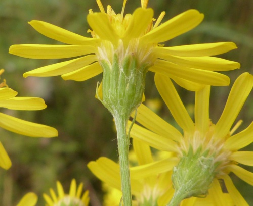 Leaves with dense cottony grey hairs on the underside; terminal lobe of leaf narrow. Phyllaries (bracts) at the base of the flower-head are about half as long as the main phyllaries. Common ragwort has basal phyllaries less than half as long as the main ones, and the leaves as more or less glabrous underneath.