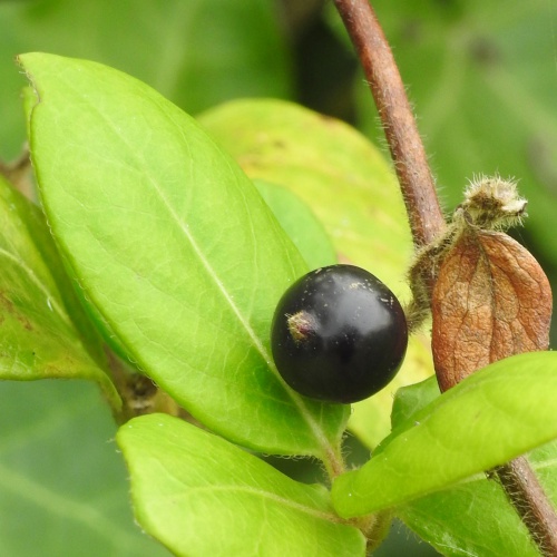 A climbing shrub to 4 metres, hairy. Leaves oval with hairy margins. Flowers white at first becoming yellowish, occasionally tinged with pink, 30 to 40 mm long, two lipped, two hairy flowers per axil with leaf-like bracts, sweetly scented. Berries red at first but black when ripe.