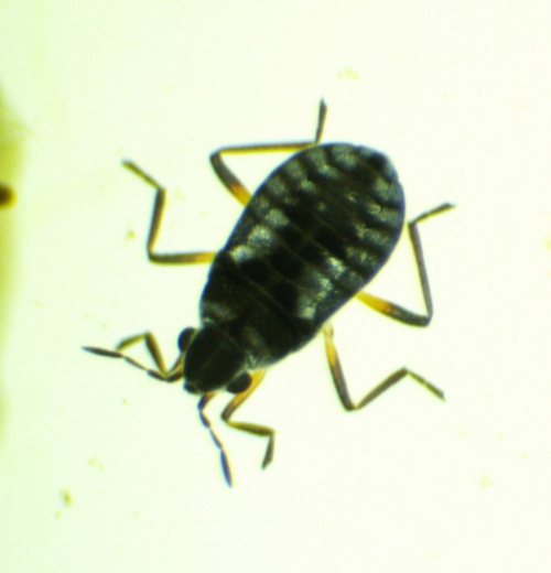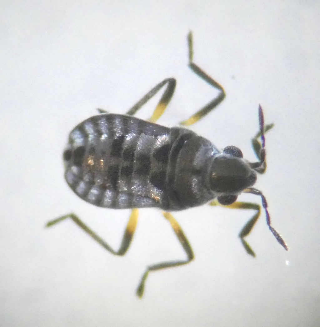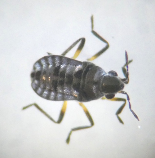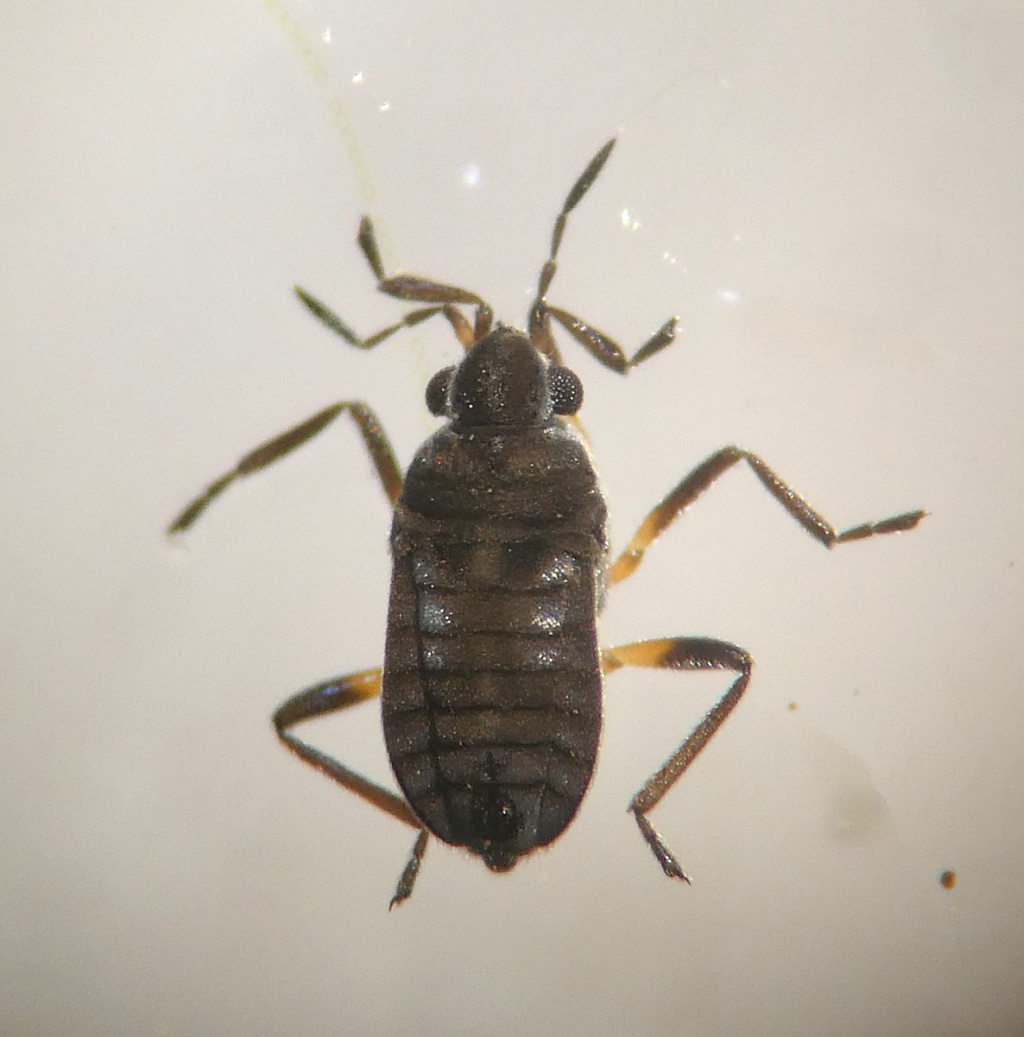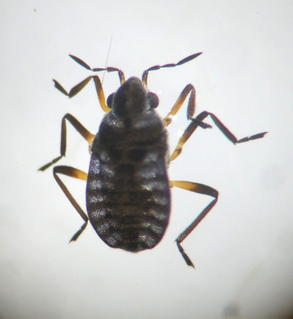 This very small (less than 2 mm) semi aquatic bug is a member of the Water Cricket family with a silvery appearance. It can walk or swim rapidly over the surface of ponds and lakes. This is made possible by a covering of fine water-repellent hairs over the body and legs, which allows the weight of the insect to be supported by the surface tension of the water. The dense covering of hairs gives these bugs a matt or velvety appearance.