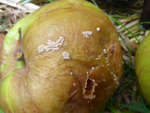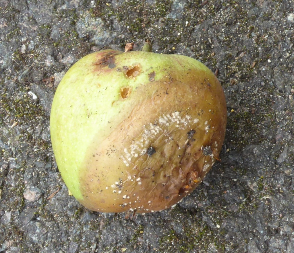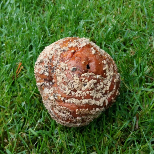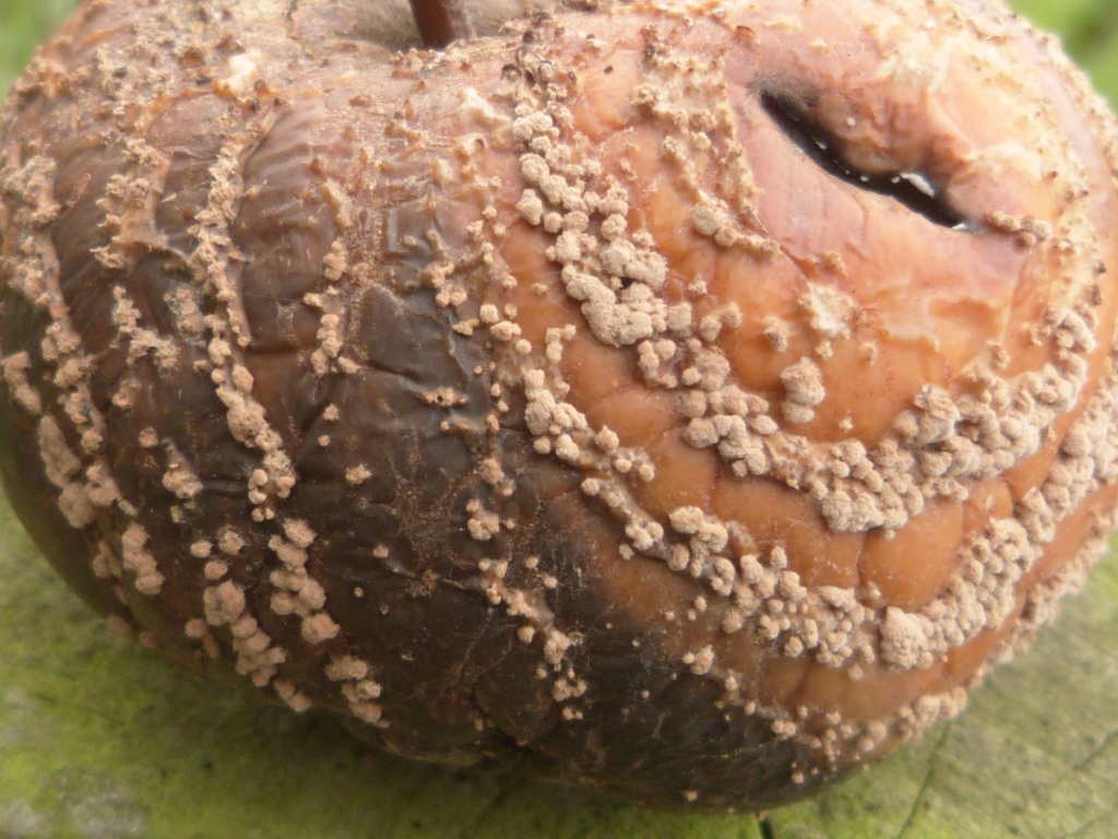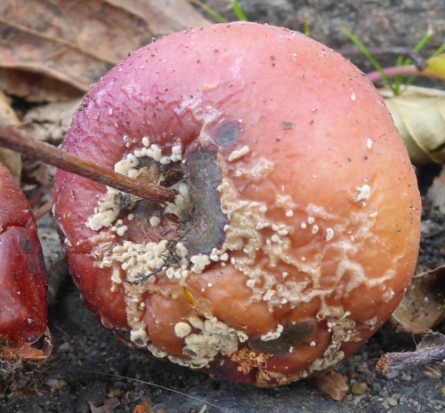 The asexual stage of Monilinia fructigena causes brown rot, mainly in apples, pears and other pome fruits. Small patches of brown rot appear on the surface of the fruit. These patches spread and cause rotting of the fruit flesh. Buff-colured pustules that produce the conidiospores appear on the surface, especially in wet weather. Often the pustules appear in circular or concentric rings. Sometimes the rot can spread to apple branchces, causing a canker. It can be a serious commercial and horticultural pathogen.