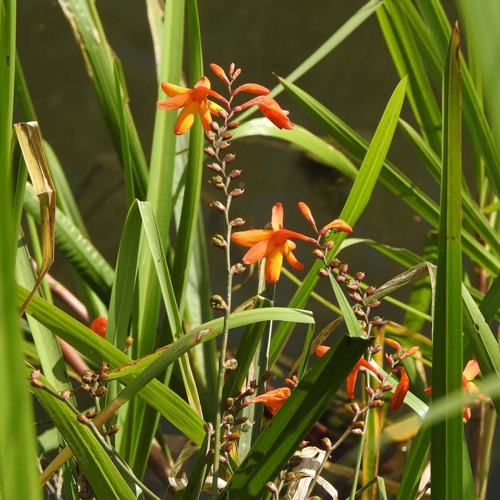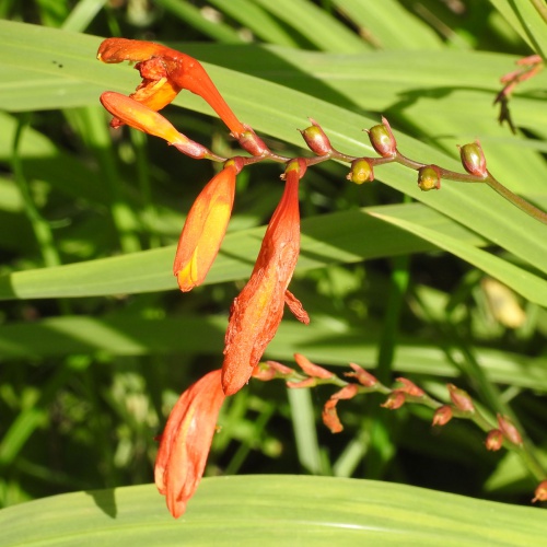 Height about 60 cm. Grows from corms to form dense clumps of upright sword-shaped foliage. It has sprays of bright orange flowers, carried in branched spikes. There are many cultivated varieties and this results in a large amount of variation.
