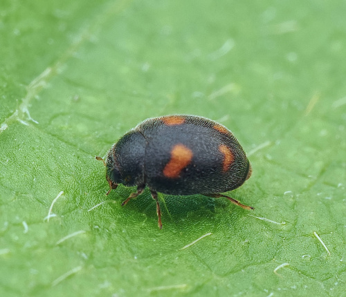 Length: 1.5 to 2 mm. Basic colour is black with four (two pairs) reddish-brown kidney-shaped spots, the front pair being larger than the rear pair. Pronotum and head colour is black. Leg colour: brown. Other features: hairy; abdomen has a reddish-brown tip.