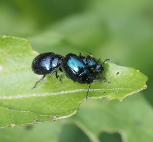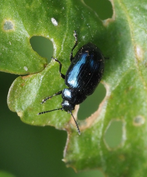 3.5 to 4.7 mm. Deep metallic. Pronotal disc with both fine and coarse punctures. Distinctly swollen 'shoulders' (humeral calli). Antennae entirely dark and widely spaced.