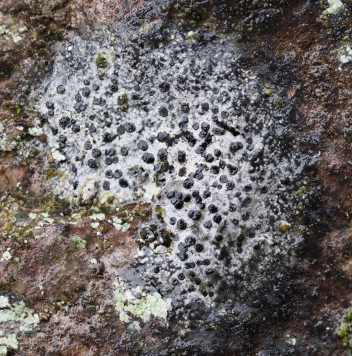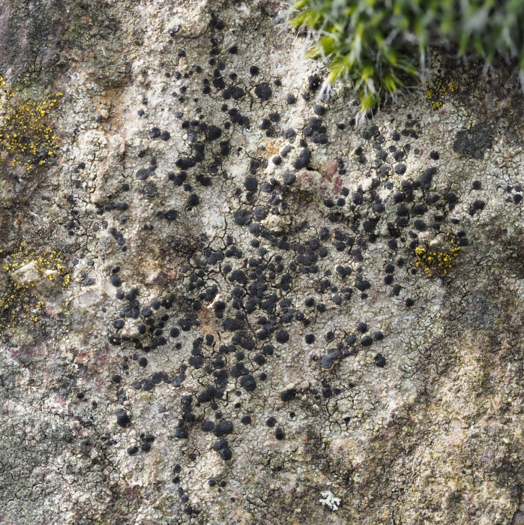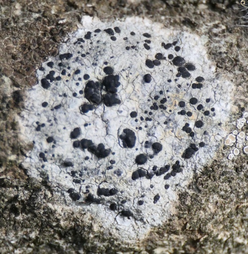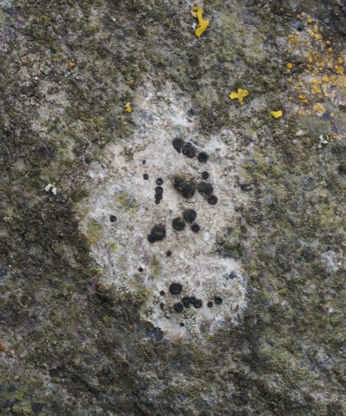 A thin, pale grey crust forming lichen with black apothecia (up to 1.5mm diameter), often in groups or lines.