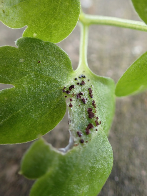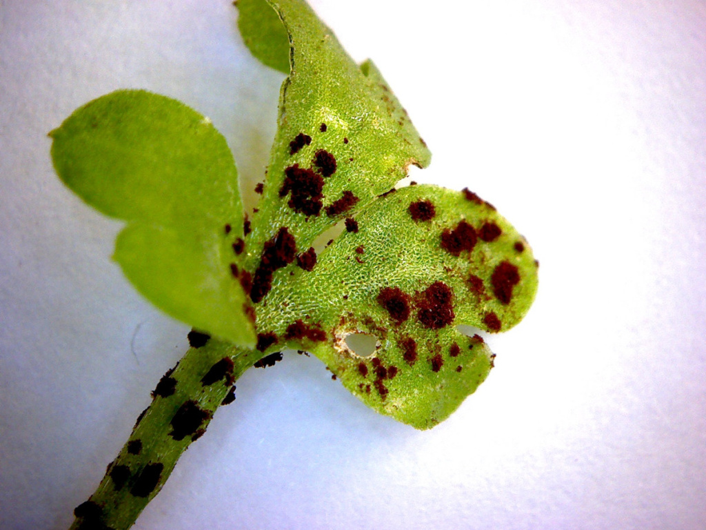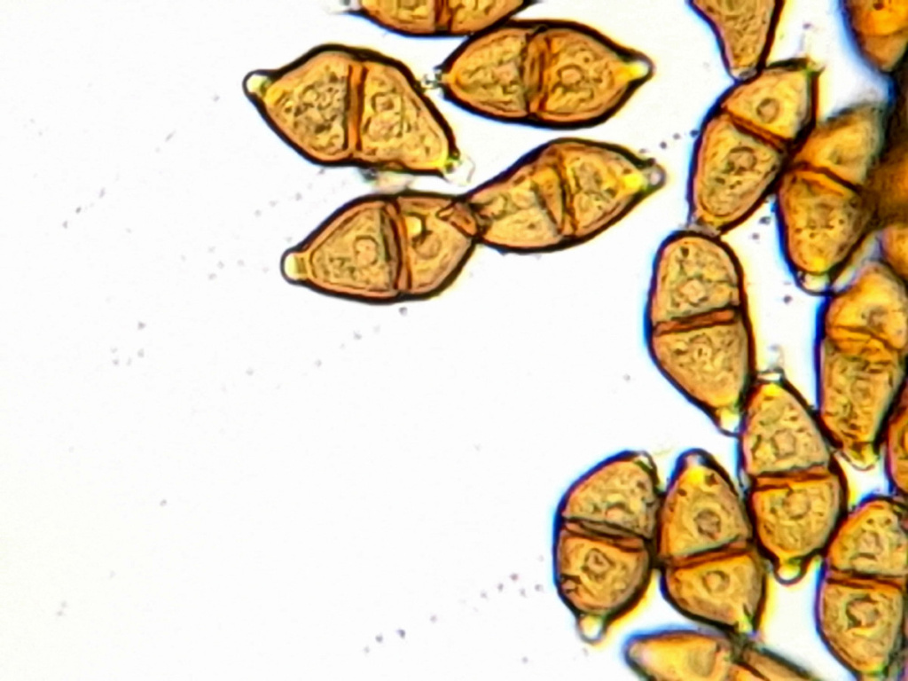 Puccinia adoxae causes galls on Moschatel (Adoxa moschatellina); the plant is stunted with swollen, distorted leaves and stems. Only chocolate-brown telia are formed, on both sides of the leaf, on petioles and stems. The teliospores are two-celled.