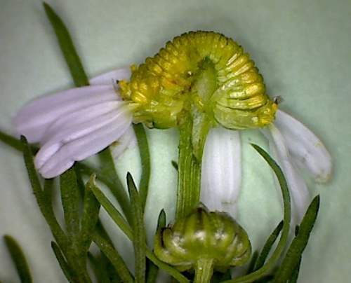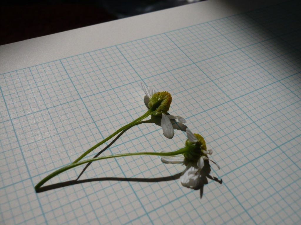 Chamomile (Chamaemelum nobile), Corn Chamomile (Anthemis arvensis), Stinking Chamomile (Anthemis cotula) and Austrian Chamomile (Cota austriaca (synonym = Anthemis)) have all been recorded in VC55, but are scarce or very rare; a specimen will be needed to verify them. They all have scales among the yellow florets on the receptacle, unlike Matricaria or Tripleurospermum. Corn or Austrian Chamomile are often included in seed-mixes of cornfield annuals, and are occasionally naturalised.