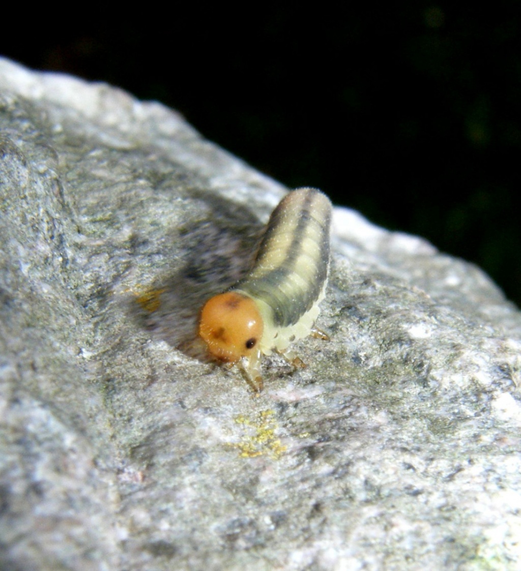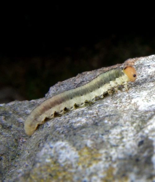 The larvae of Sciapteryx consobrina are highly variable both in colour and black patterning. The ground colour can vary from yellow, grey, green to absolutely black with the complete pattern of the black spots on the one hand to the specimens with the black spots completely missing on the other hand. Likewise, the black head pattern is also highly variable varying from black headed larvae to the quite orange headed larvae with all conceivable intermediate variants between them. The adult sawfly is mainly black in colour, but the abdomen has narrow pale bands. We are grateful to experts John Grearson and Jan Macek of the Czech Republic for their help with identification of this difficult species.
