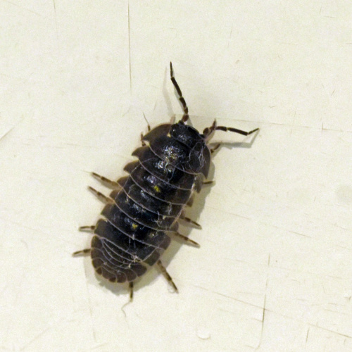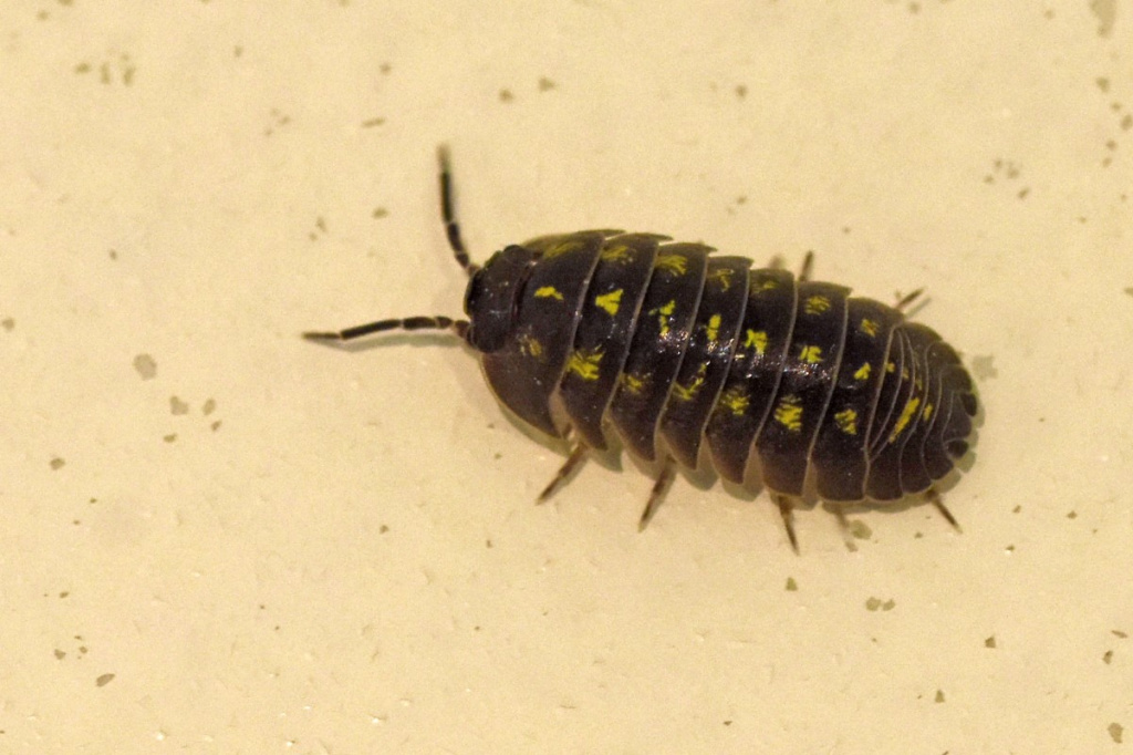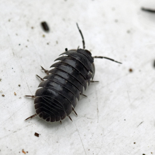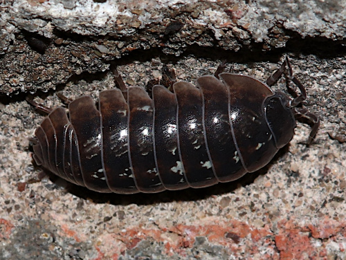 Armadillidium depressum is a dark grey to black species and may reach a length of 20 millimetres. It is very similar to Armadillidium vulgare (which may reach 18 millimetres). Both species are capable of rolling into a ball when disturbed but Armadillidium depressum can be distinguished because it leaves a gap when enrolled, instead of completely enclosing like Armadillidium vulgare. Another distinguishing feature is that its pleon curve outwards, causing a splayed appearance.