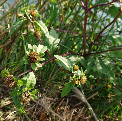Very variable plant to about 50 cm. Erect stems. Leaves opposite, usually three lobed occasionally 5 lobed with lanceolate, coarsely toothed divisions. Leaf stalks are short and winged. Flowerheads yellow 10 to 25 mm. Erect in branched clusters. Achenes with 3 or 4 barbed bristles. Detailed examination of the plant is necessary for a safe id.