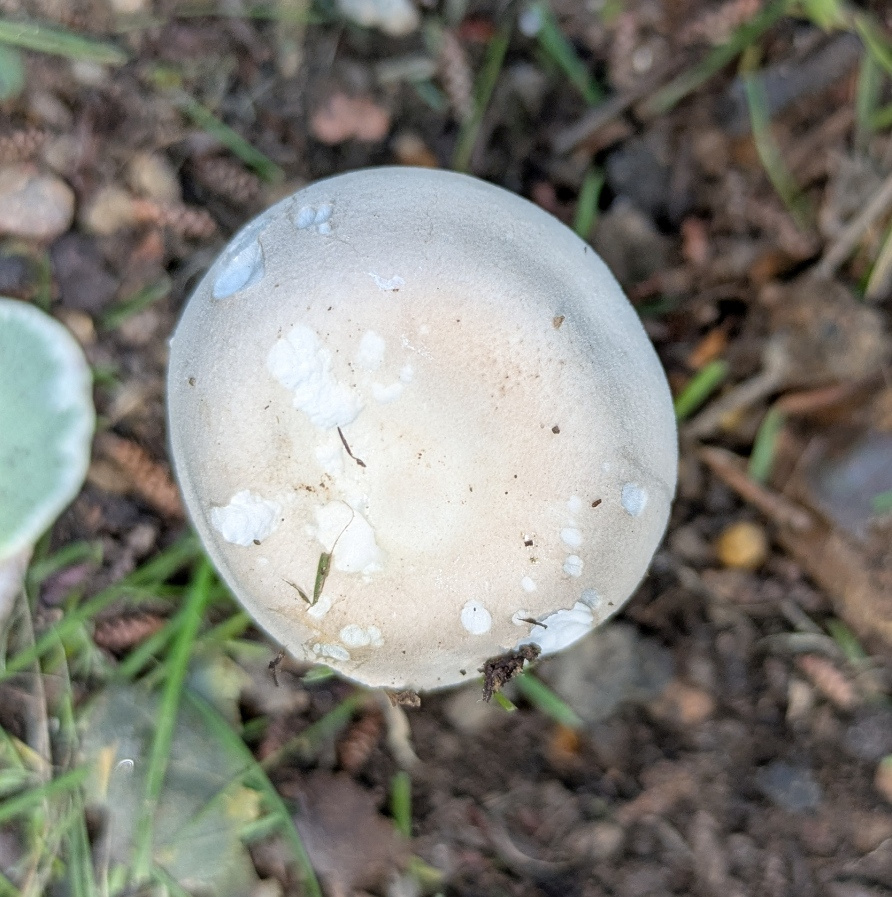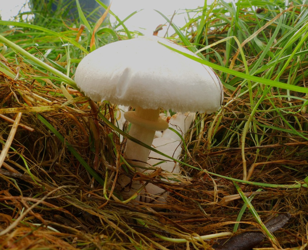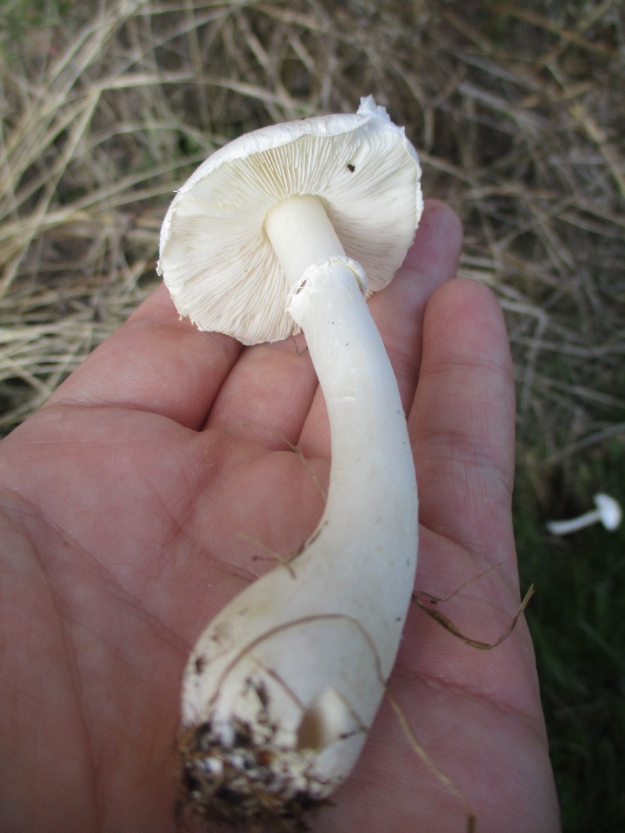 A large white fungus with white gills that darken to a pale pinkish colour at maturity. The cap may be smooth or with small scales, and the base of the stipe is bulbous. It has a white spore print.