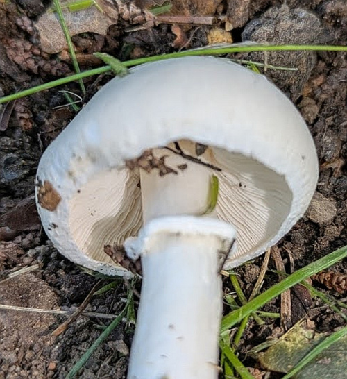 Agaricus species have pink or brown gills and brown spore-print; white Amanita species have a volva.
