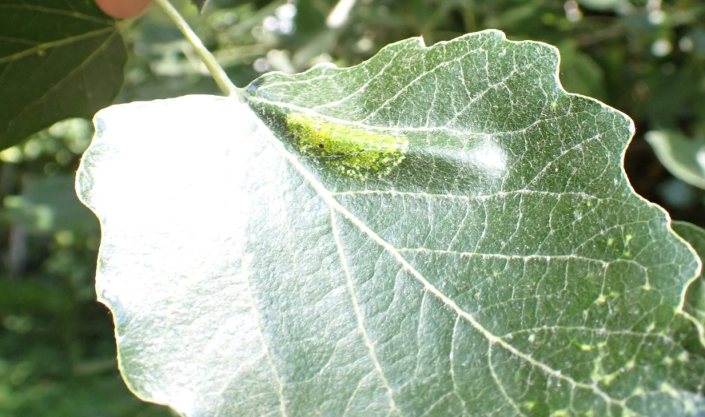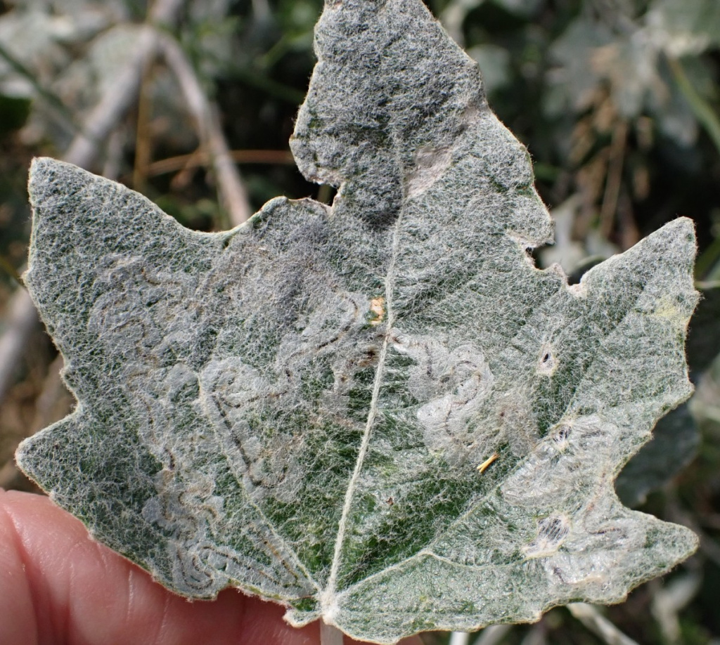 The larva of the moth Phyllonorycter comparella makes a mine on the underside of leaves of Grey Poplar, White Poplar and occasionally Hybrid Black Poplar. The mines are small and hard to find on the commonest hosts, Grey or White Poplar; there is little contraction or distortion of the leaf, and the underneath of the mine is hidden in the woolly undersurface of the leaf.