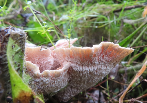 - Capped - a shelf/bracket or hoof-like form with a distinct cap on upper surface and a fertile surface with pores underneath e.g. Blushing Bracket or Hoof Fungus